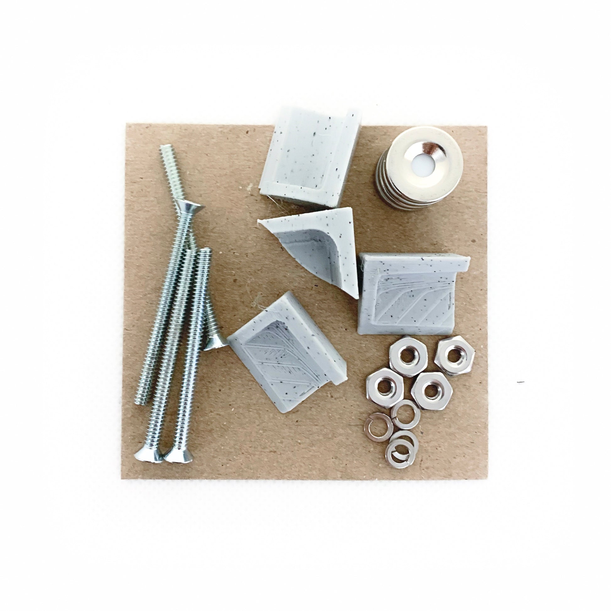 - (x4) counter sunk 1/2" n52 or n42 magnets and ~1/8" thick (like these). Technically you could use any countersunk magnet you wanted, so long as the countersunk hole allows the screw head to fully within the magnet.