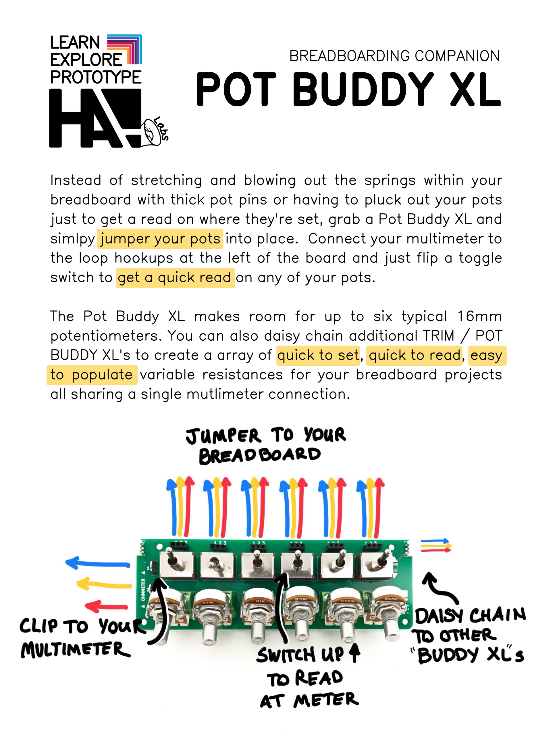 Instead of stretching and blowing out the springs within your breadboard with thick pot pins or having to pluck out your pot just to get a read on where it's set, grab a Pot Buddy XL and then jumper your pots into place.