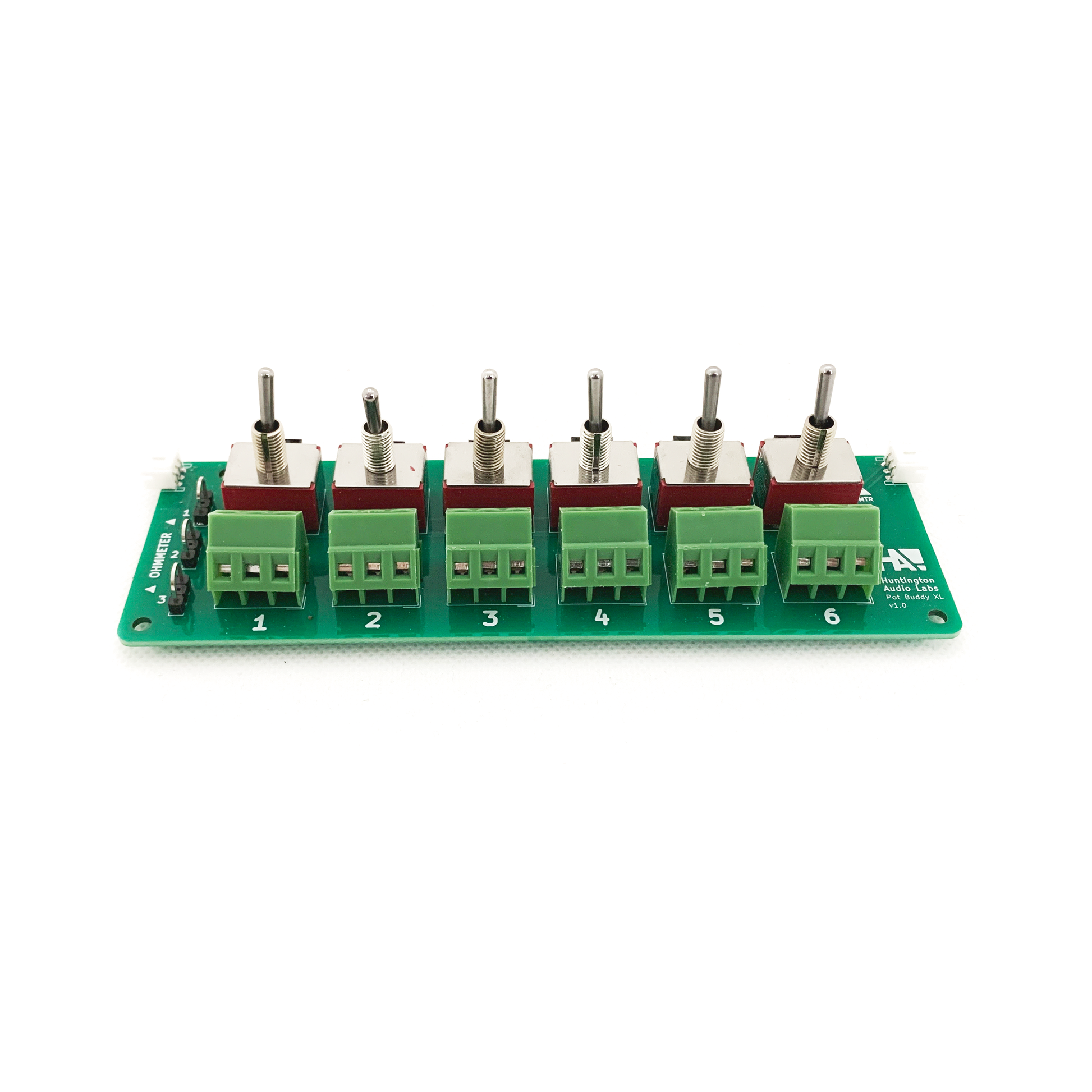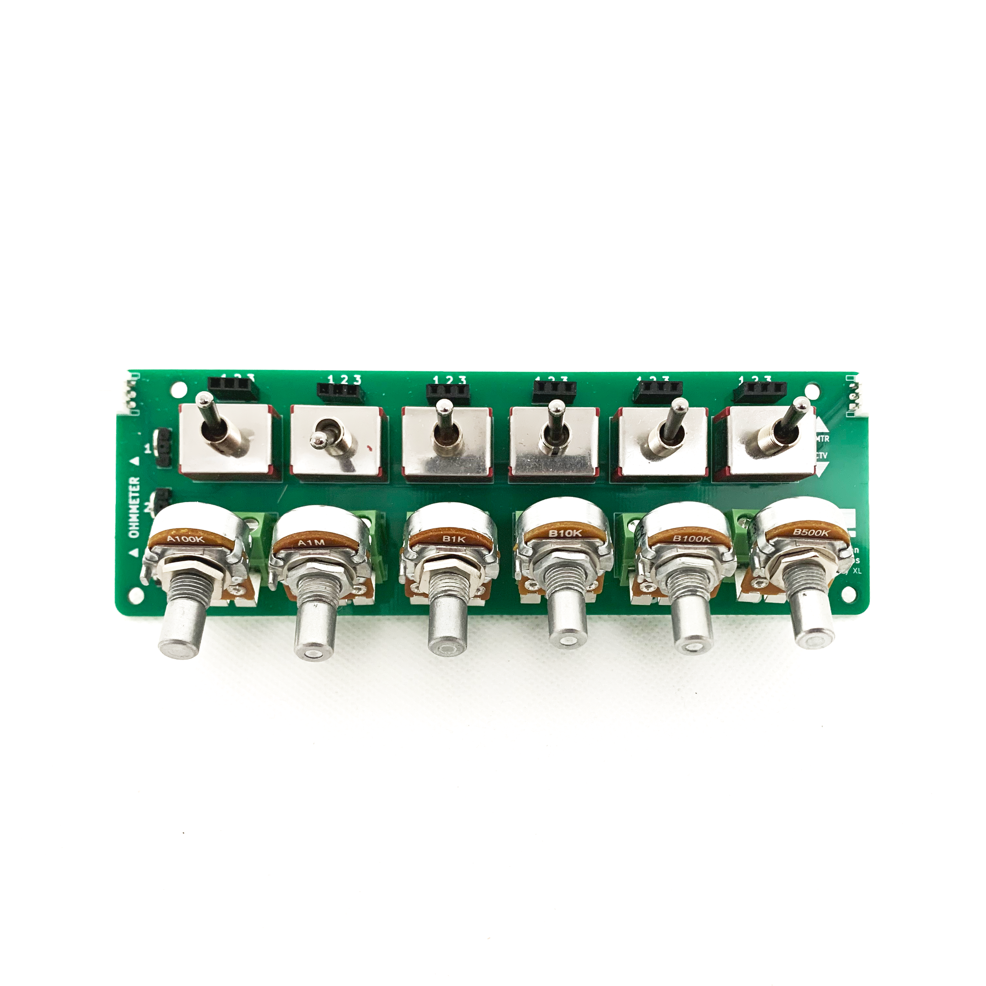 Connect your multimeter to the loop hookups at the left of the board and simply flip a toggle switch to get a quick read on any of your pots.